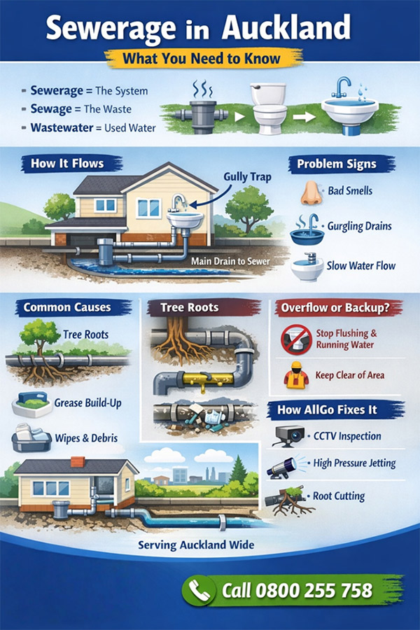 AllGo Plumbing handles sewerage and drainage work Auckland-wide. That means you can call, explain what you are seeing, and get a straight plan of action.